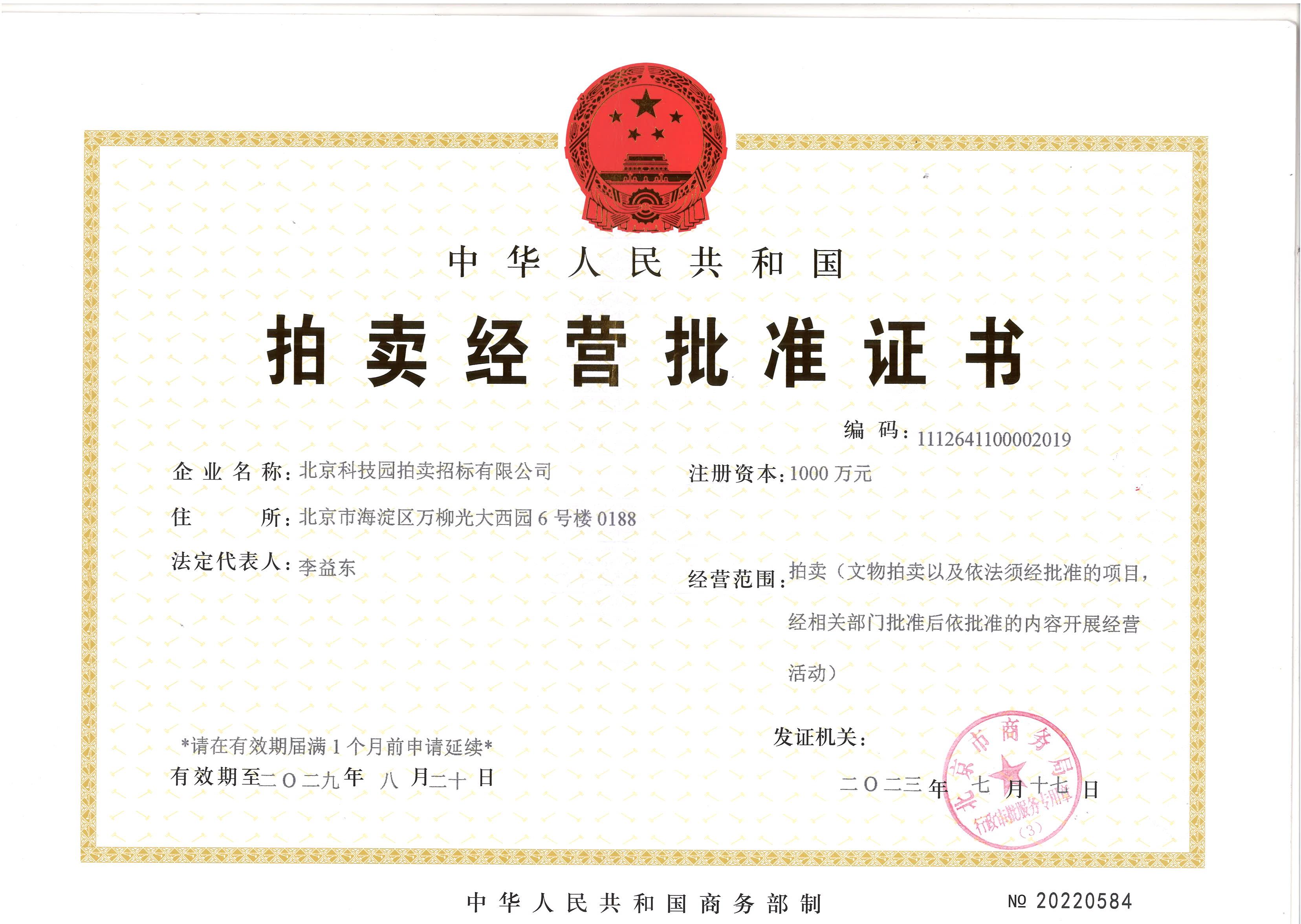 拍賣經(jīng)營批準證書