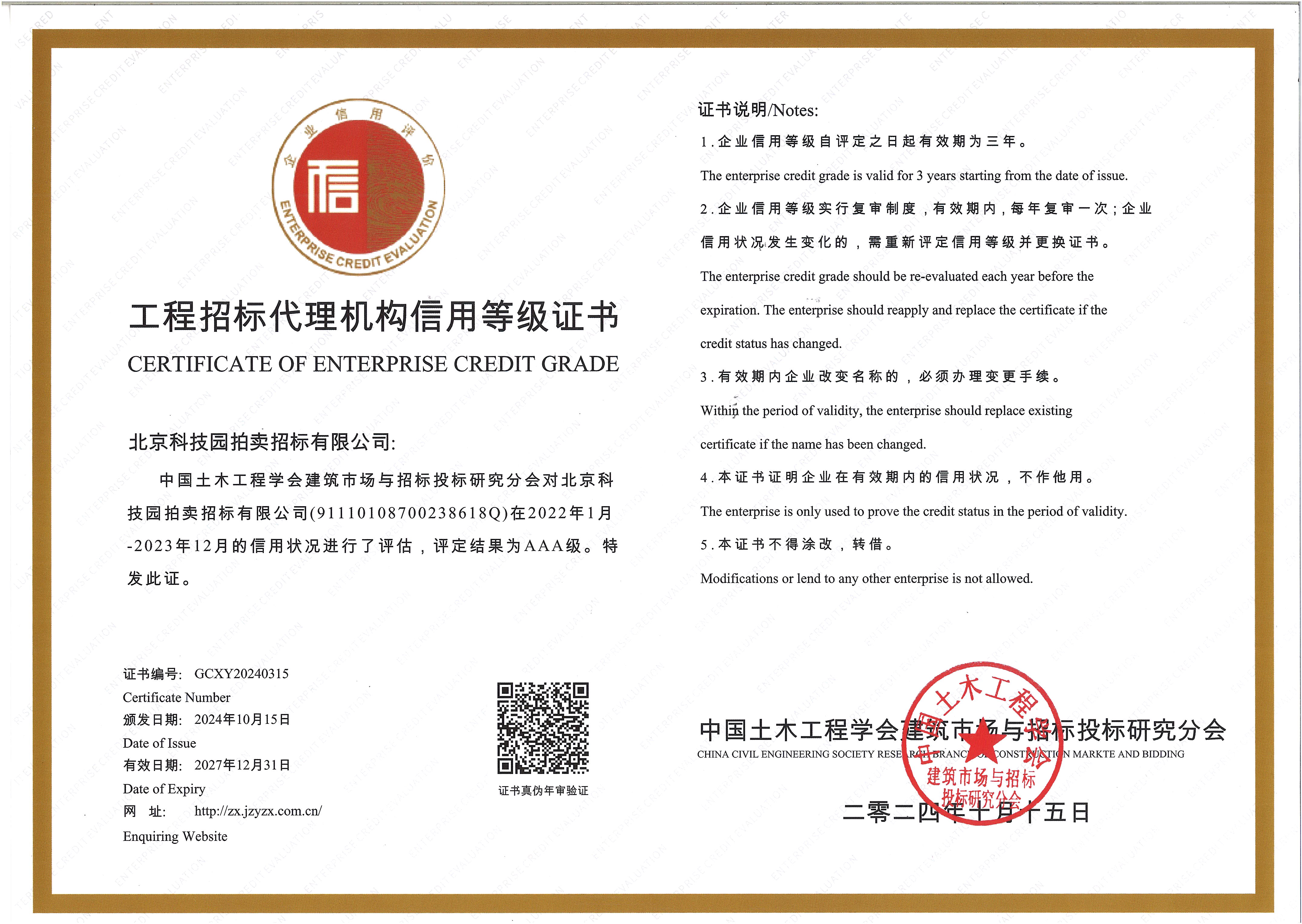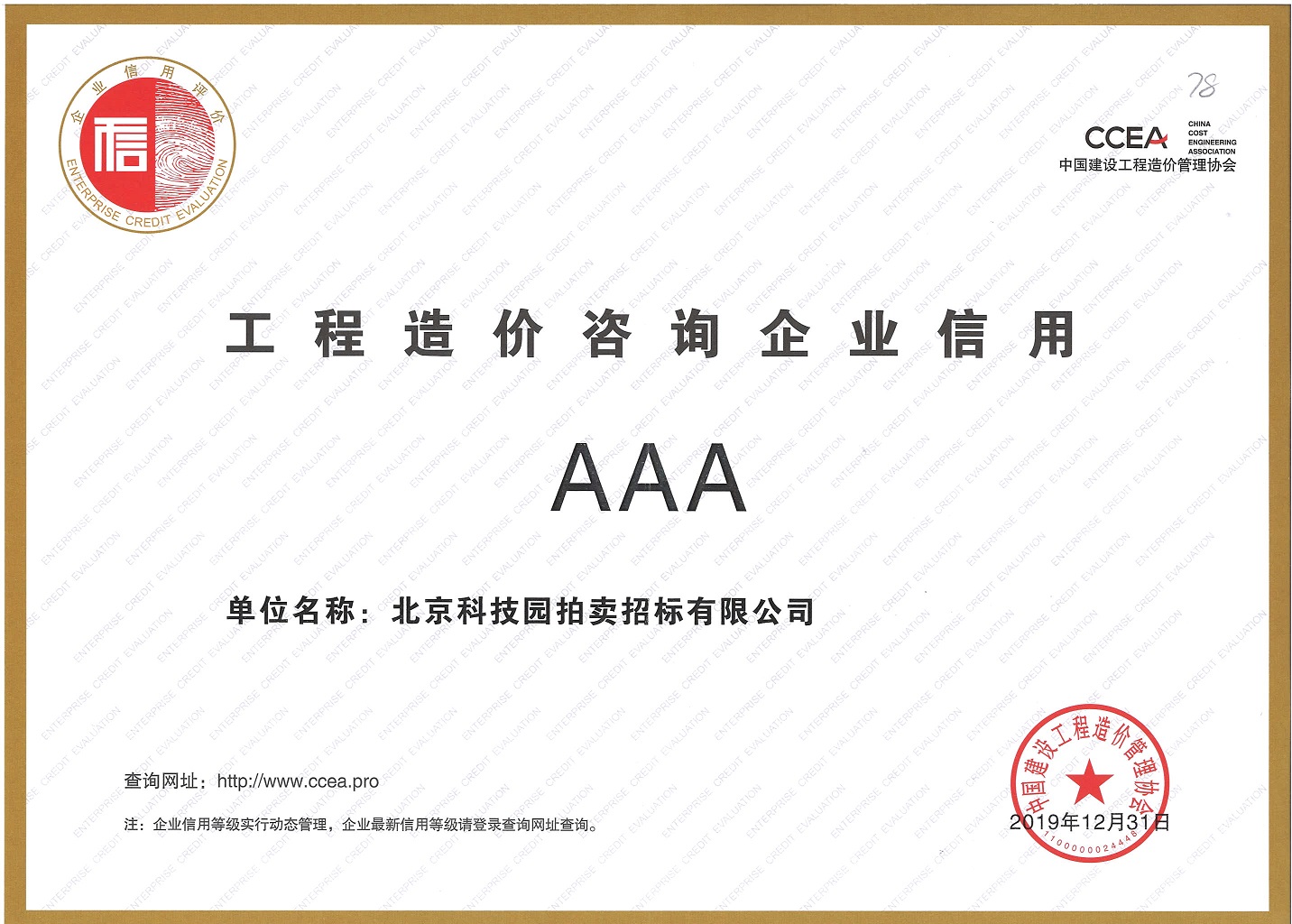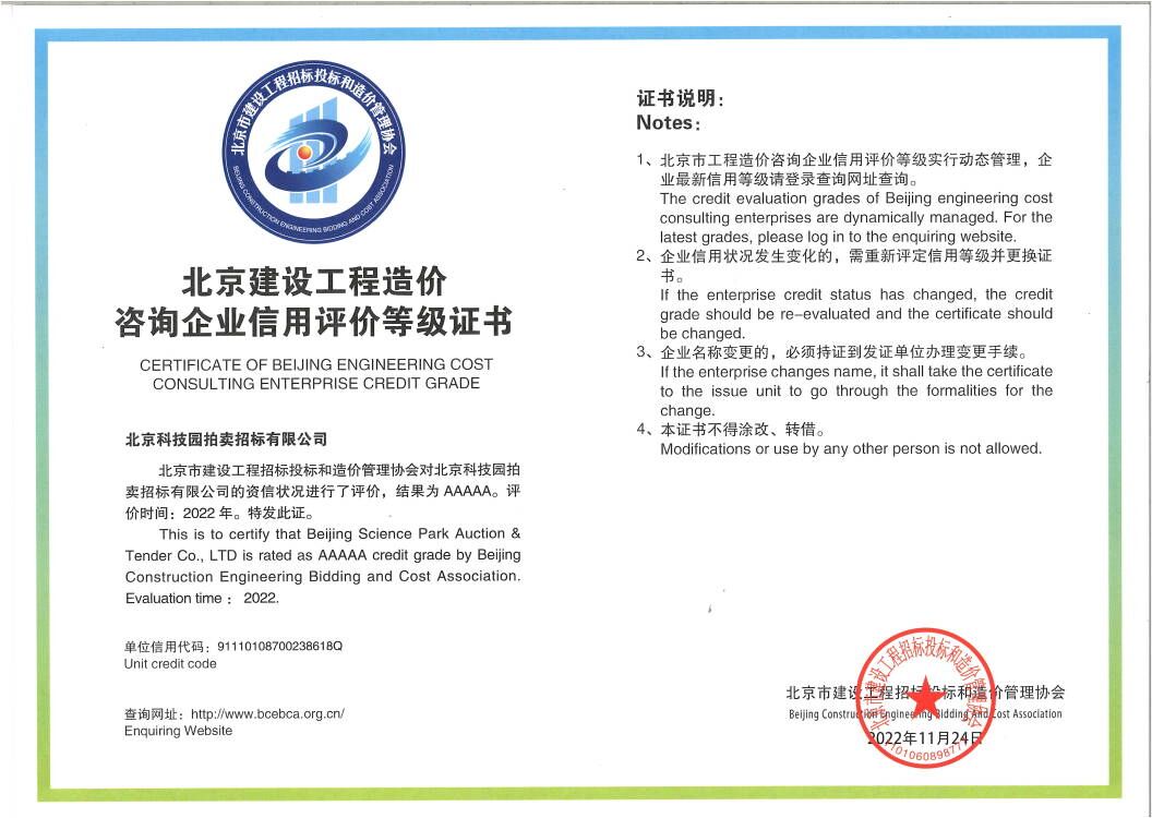 工程造價咨詢企業AAA信用證書