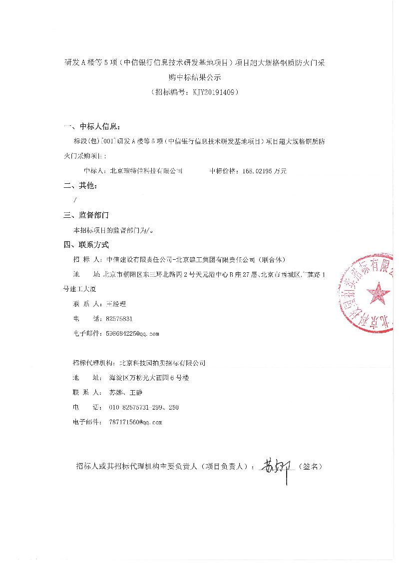 研發A樓等5項(中信銀行信息技術研發基地項目)超大規格鋼質防火門采購中標結果公示